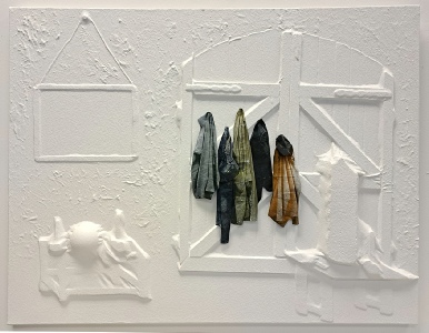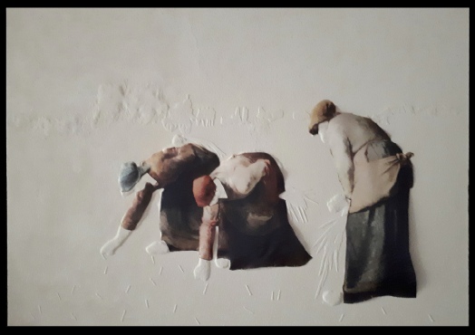 take the form of low relief mixed media canvasses. Each canvas echoes the size of the original work.They involve studying the original work in detail, unpacking the perspective, and making extensive material decisions.